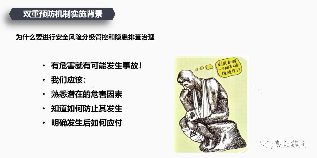 在培訓活動中,朝陽集團申總詳細給員工講解了風險分級管控、隱患排查治理的概念、方法和流程等,并強調了雙重預防機制在安全生產中的重要性。申總首先對雙重預防機制的定義進行了闡述,再對風險分級管控與隱患排查治理的雙重預防機制進行了深入的講解。